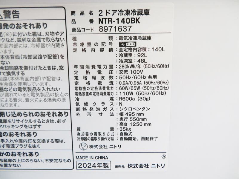 ニトリ 2ドア冷蔵庫 140L 2024年製 NTR-140BK ノンフロンタイプ KL01