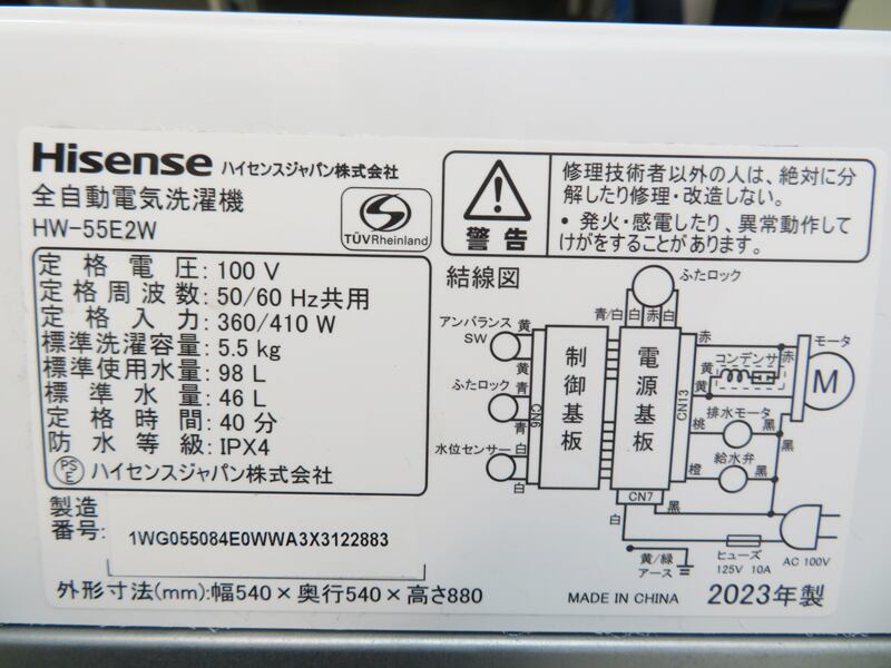 ハイセンス 全自動洗濯機 5.5kg 2023年製 HW-55E2W ガラス蓋 パワフル洗浄 風乾燥機能 JS04