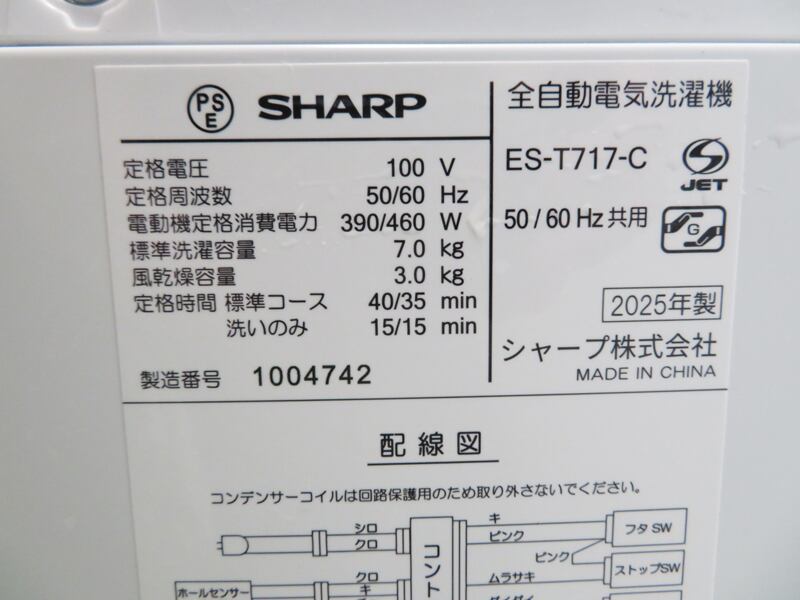 シャープ 全自動洗濯機 7.0kg 2025年製 ES-T717 風乾燥機能搭載 KS03