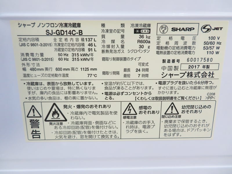 SHARP シャープ 冷凍冷蔵庫 137L 2017年 SJ-GD14C LL04