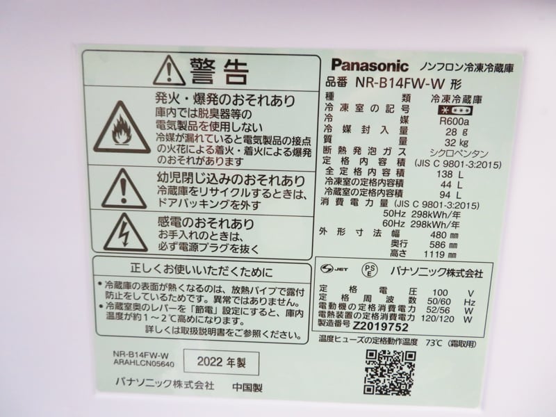 Panasonic 冷蔵庫 138L 2022年製 NR-B14FW LL06