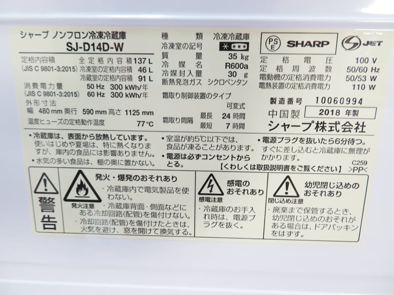 シャープ 2ドア冷蔵庫 137L 2018年製 SJ-D14D 一人暮らしに最適 IL06
