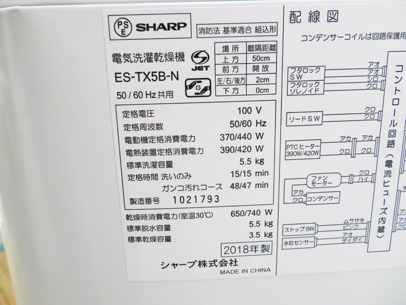 SHARP 洗濯乾燥機 5.5kg 2018年 ES-TX5B LS03