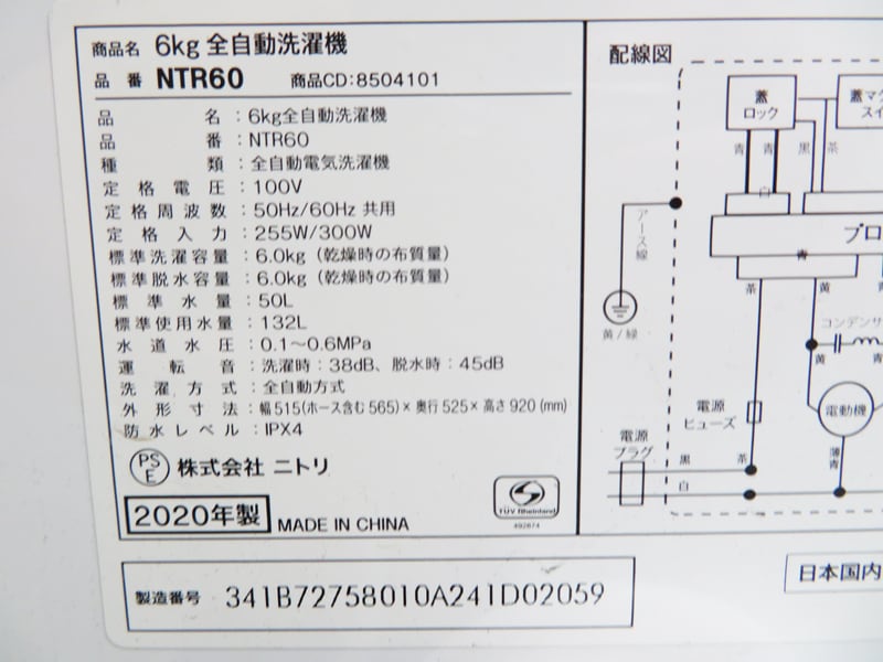 ニトリ 6.0kg 洗濯機 NTR60 2020年製 AS02