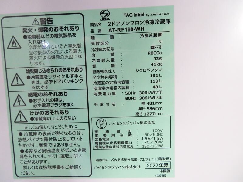 【徹底清掃済】 amadana 162L 冷凍冷蔵庫 AT-RF160 2022年製 CL02