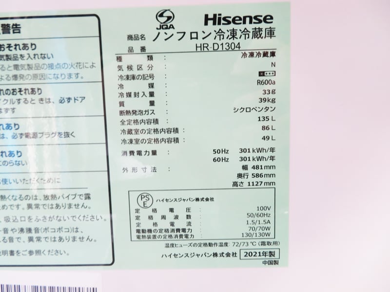 【徹底清掃済】 Hisense 135L 冷凍冷蔵庫 HR-D1304 2021年製 CL04