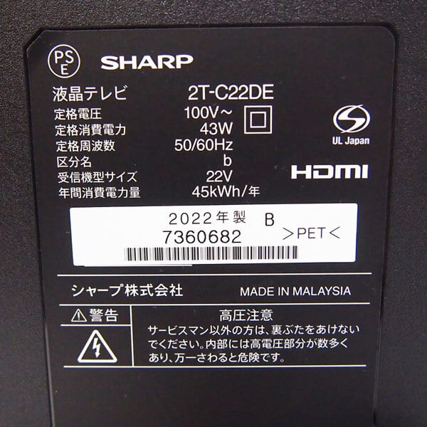 良品 22V型液晶テレビ SHARP AQUOS 2T-C22DE 2022年製 CA12