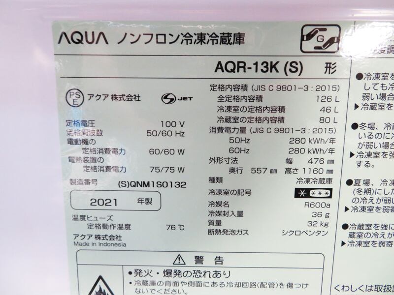 【徹底清掃済】 アクア 126L 2ドア冷凍冷蔵庫 AQR-13K 2021年製 CL11