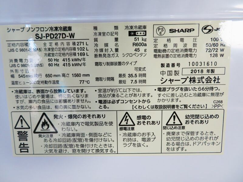 【徹底清掃済】 シャープ 271L 2ドア冷凍冷蔵庫 SJ-PD27D 2018年製 CL12