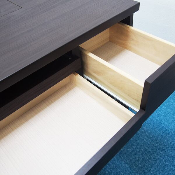 ◆天板後方には、ふた付きの電源タップやコードを収める収納スペース付き。